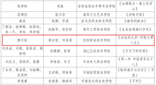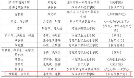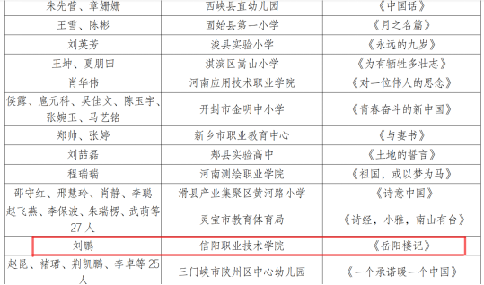 河南省教育厅发布《河南省教育厅关于公布第四届中华经诵写讲大赛经典诵读作品评选结果的通知》(教社语〔2022〕252号),青年教师刘鹏的作品《岳阳楼记》经过与全省所有高校、中小学教师同台竞技,获得教师组一等奖的优异成绩。李秀林、鲍婕老师指导的作品《永生的和平鸽》,蒋吉优、邓亚丽老师指导的作品《永远的九岁--写给小萝卜头》均获职业院校员工组一等奖的好成绩。