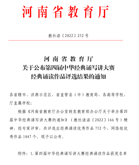 近日,河南省教育厅公布了第四届中华经典诵写讲大赛经典诵读作品评选结果,yl9193永利报送的三项作品喜获三个一等奖。