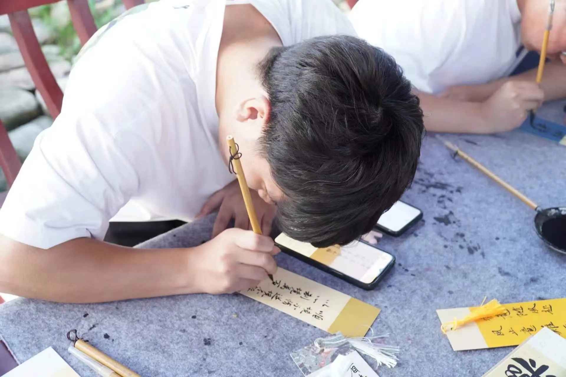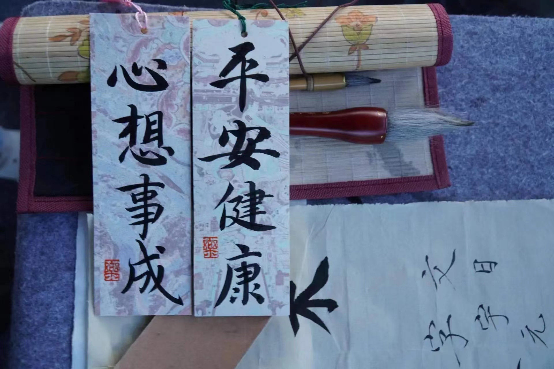 在快节奏的生活中,我们常常会步履匆匆,忽视了自己的内心。这时候,不妨停下脚步,拿出一点时间,一支笔,听听自己内心的声音,在纸上勾勒文字。生活的智慧之一,就是由一种方式走出一种困境。一笔一划间,皆为心声,尽是情感的流淌与书法。这种安静的运动方式——写字,笔纸交融,凝神静思,便可消除一切杂念。为此,兰亭书法协会开展“文以载情,书以达意”书法文创活动,在匆忙的日子里用文字载托情感,以书法告达情意。活动期间,我们以出售钥匙扣、风车、团扇、纸袋、书签、相框,并免费题字作为此次活动的主要方式,大家都把对自己,对朋友,对家人的祝福展现在一笔一划的文字之间。